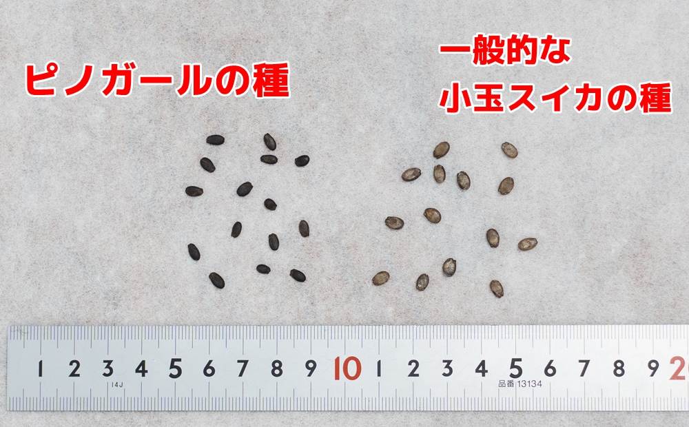 当園が通販でお届けするスイカ「ピノ・ガール」は、種がとても小さく、なんと通常のスイカの4分の1サイズ!
